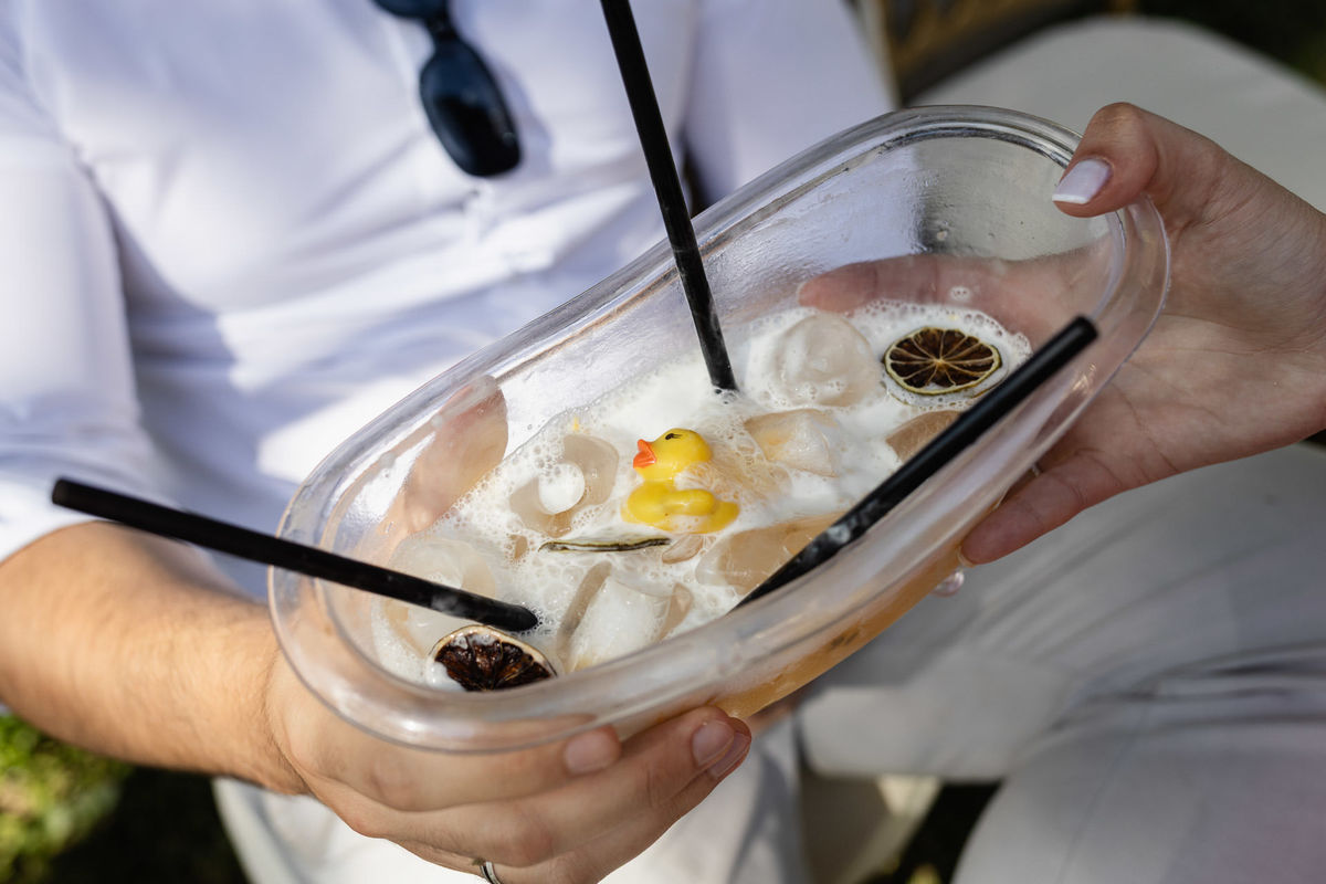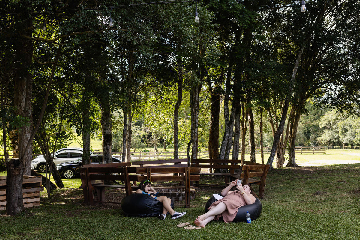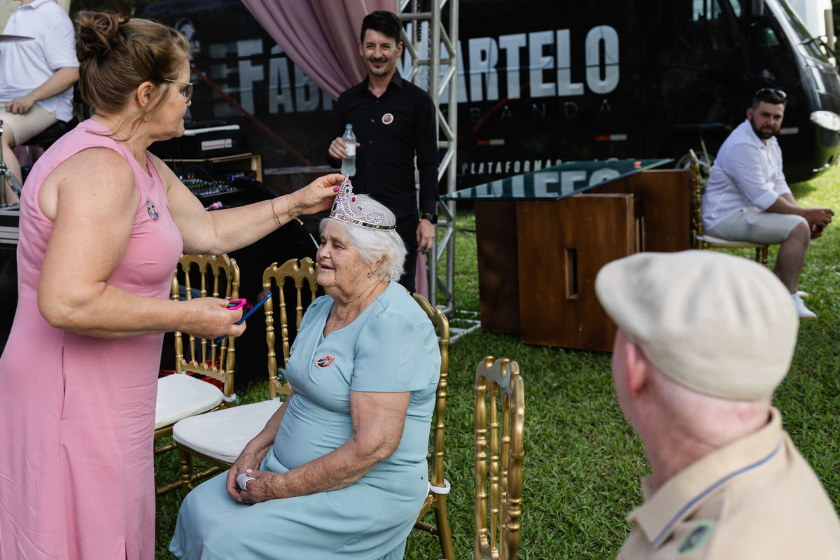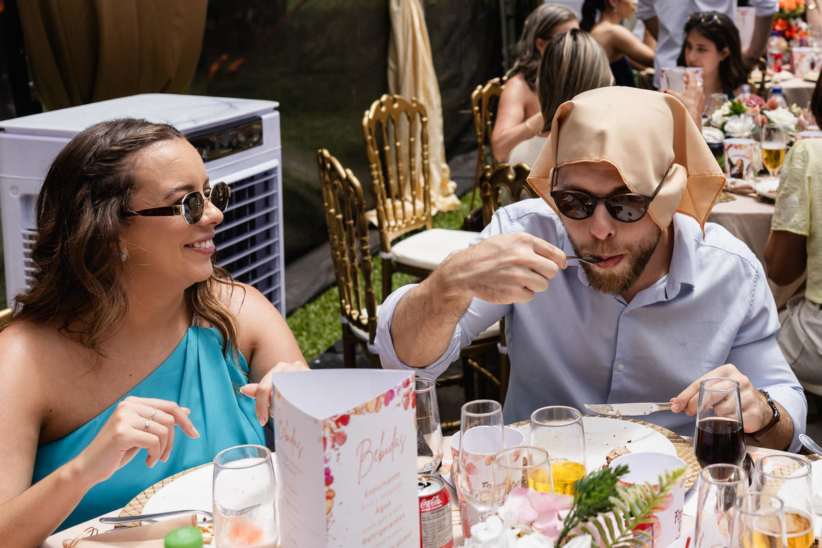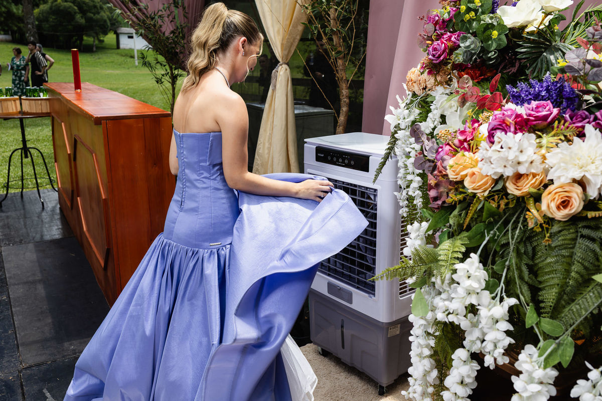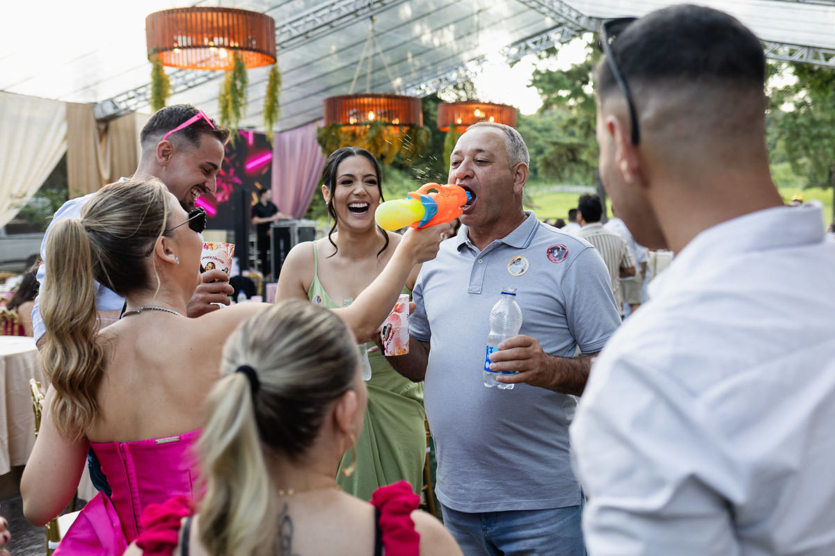 O dia estava quente, típico janeiro de verão, e a festa aconteceu em ambiente externo. Para refrescar os convidados, não faltaram água gelada, picolés e condicionadores de ar estrategicamente espalhados pelo espaço. Tudo pensado para que o conforto acompanhasse a animação.